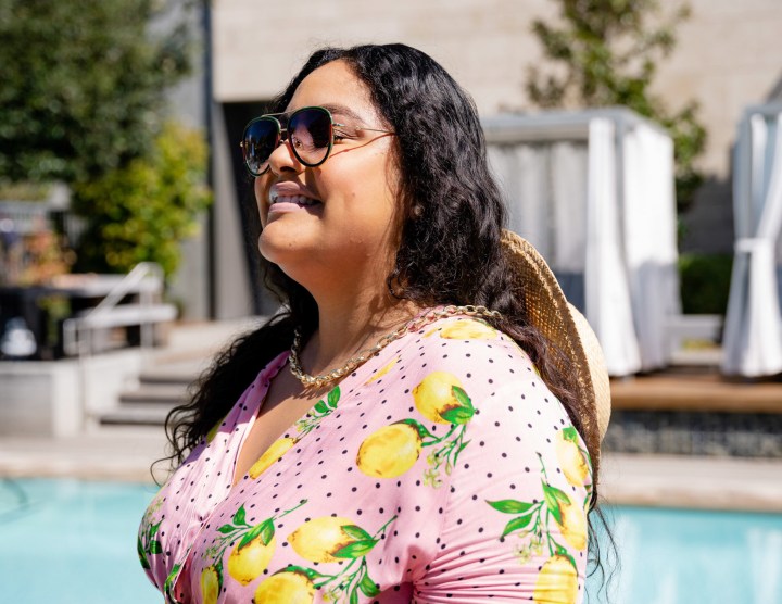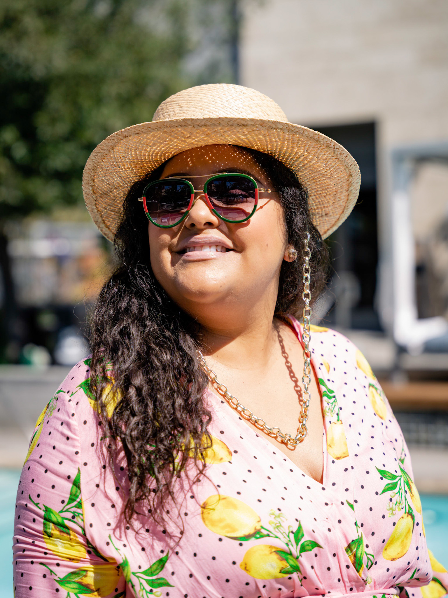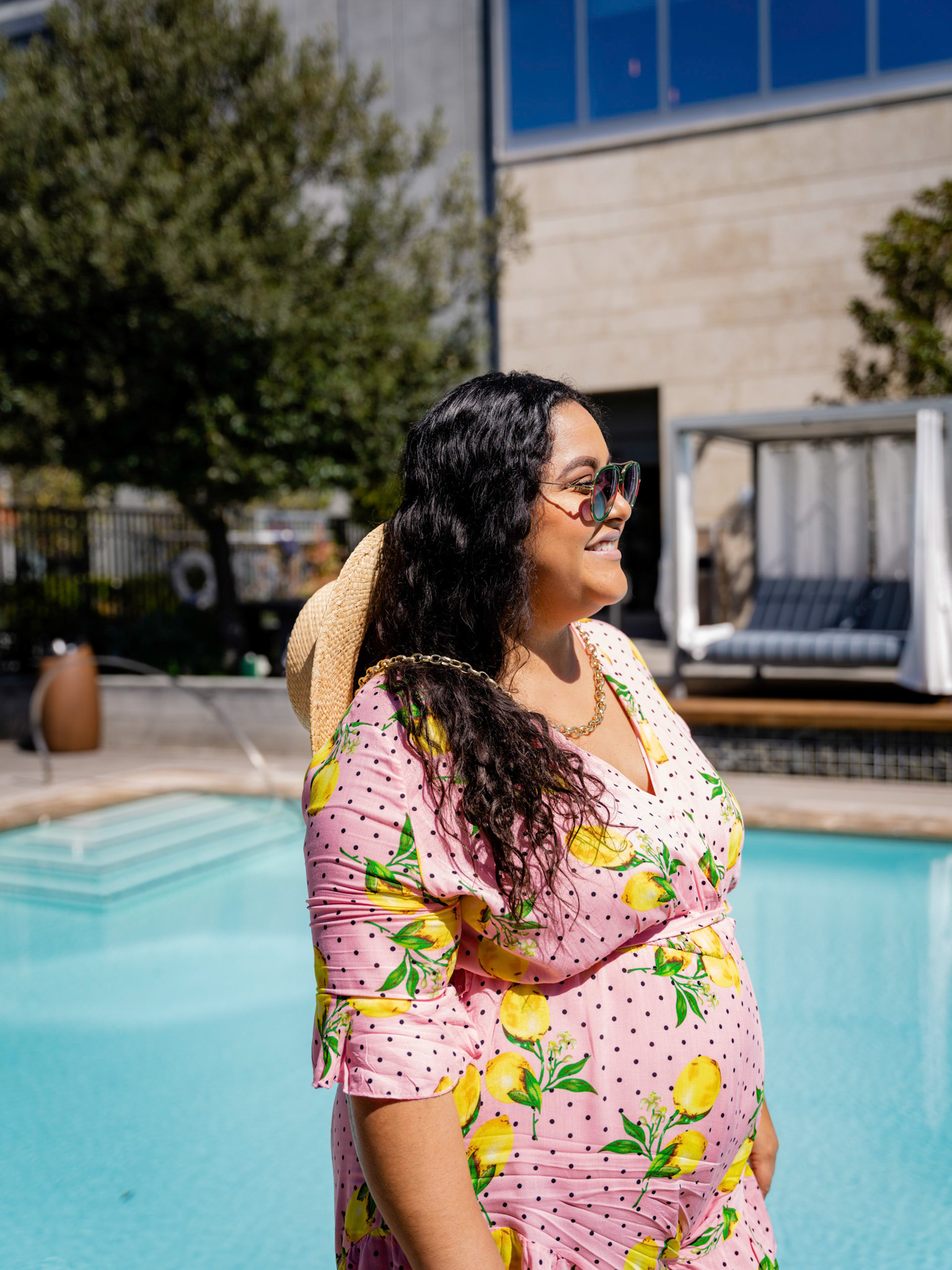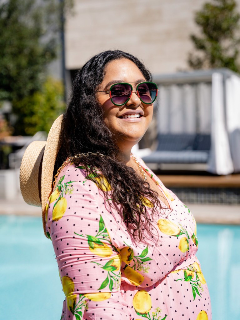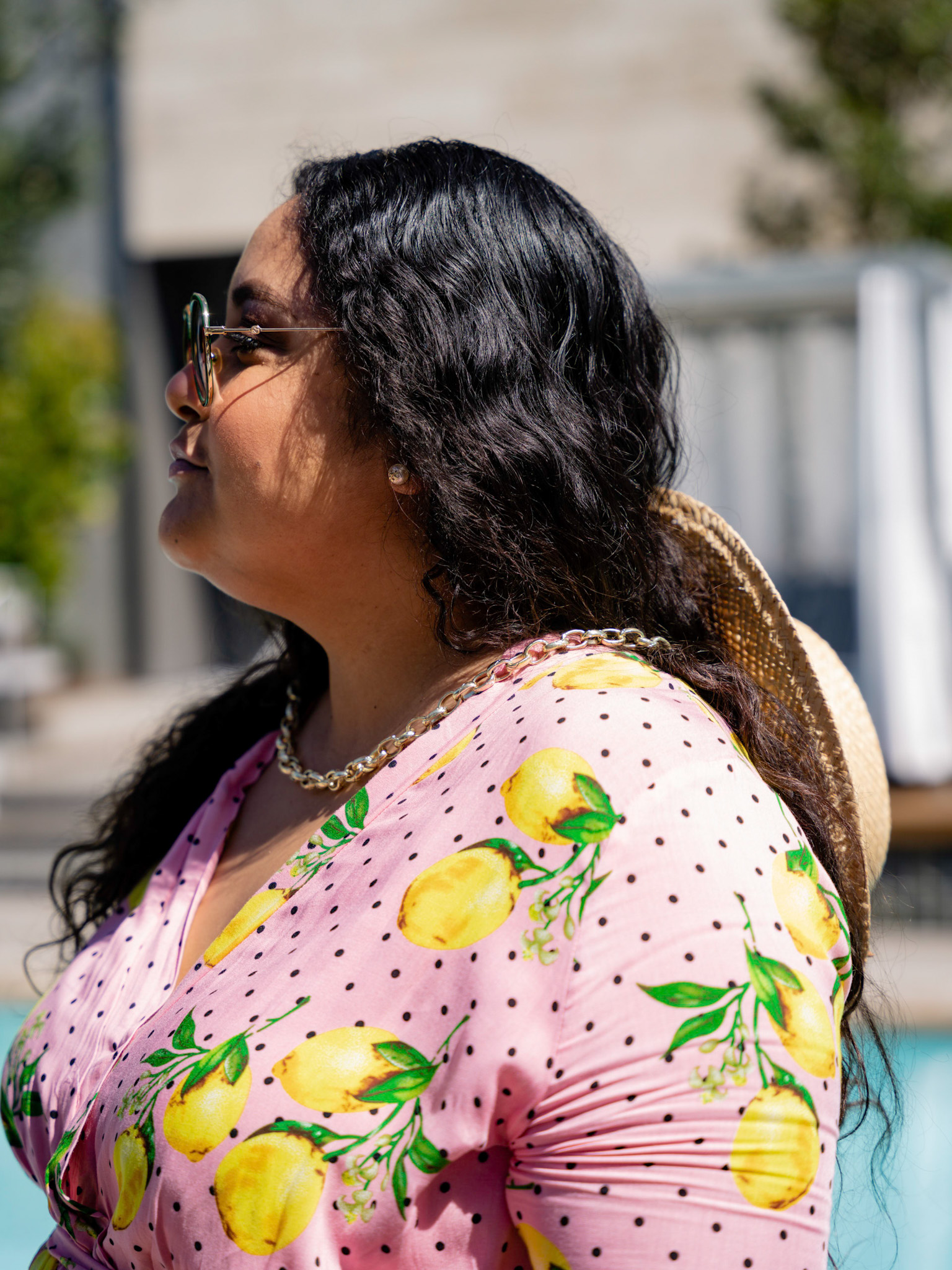 Styled below with a casual and comfortable summer outfit. Pink lemon romper and some sunnies.