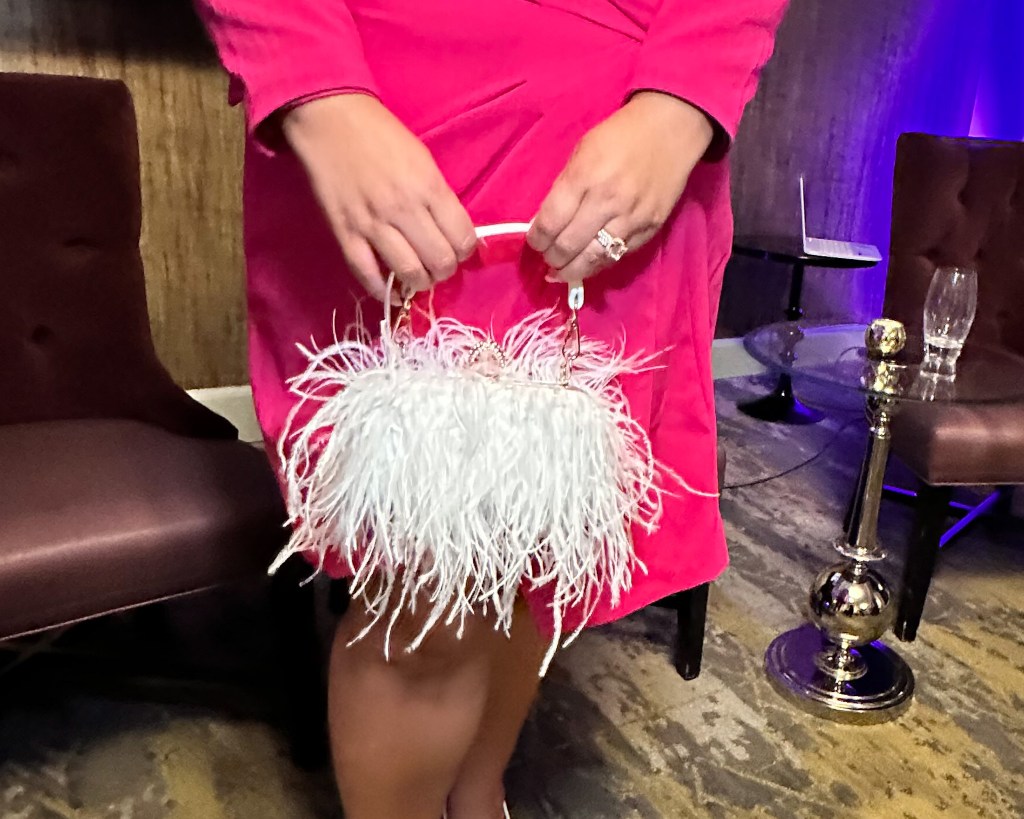 If you’ve been following my style, you know how much I love feather everything. I love feathers because it elevates. This Zalia Atelier posh feathered handbag design is fantastic to do just that. The interior lining of the bag is pink, it has a beautifully blinged out ring detail and two different strap sizes. One of the strap sizes is to wear it as a crossbody and the other as a handbag.